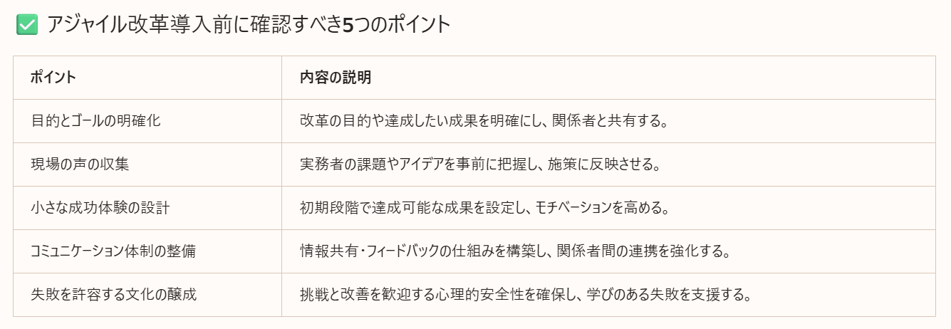 アジャイルは単なるフレームワークではなく、マインドセットの変革です。そのため、成功のためには以下のポイントを押さえる必要があります。