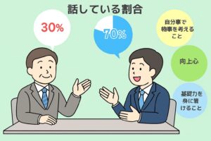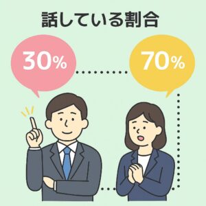 あるテーマや出来事に対して質問形式で社員に問いかけて社員からの意見を聞きます。その時、あなたが喋るより社員にたくさん喋ってもらうことに注力し、集中し、社員からの発言には否定せずに相槌を打ちながら、時には復唱し、相手に寄り添う共感的な理解を示すことで相手との距離がだんだん近くなっていきます。