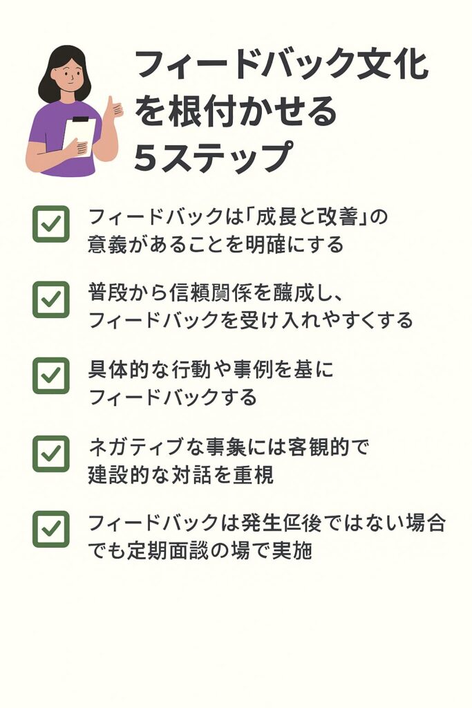 さらに、効果的なフィードバックは信頼関係があってこそ成立します。一対一の対話や定期的なコミュニケーションを通じて、互いの信頼を深めましょう。安心して意見を言える環境こそがフィードバックの効果を最大限に引き出してくれます。