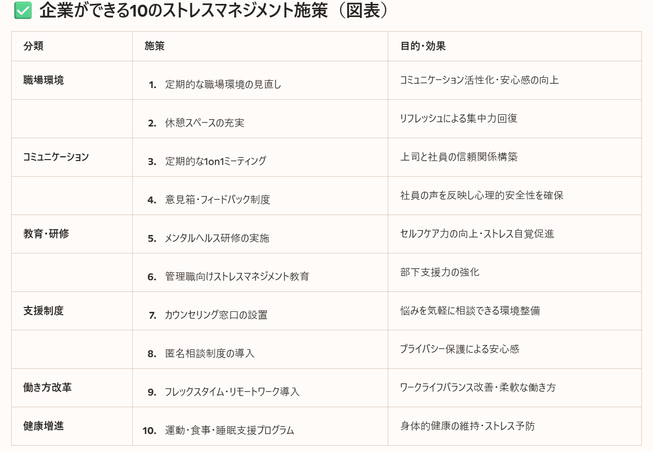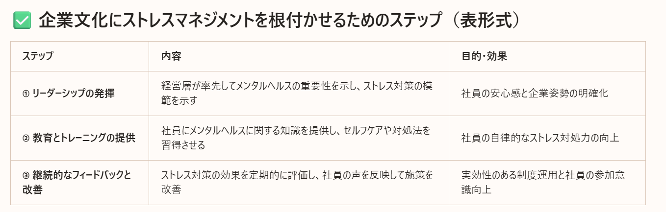 ただ施策を導入するだけでなく、企業文化として根付かせることが鍵です。そのためには、トップが率先してストレスに対する理解と支援の姿勢を示し、組織全体に浸透させる必要があります。