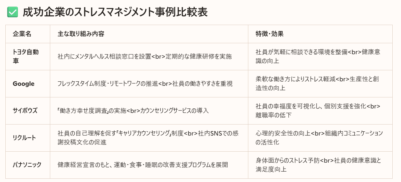 • トヨタ自動車: メンタルヘルス相談窓口を社内に設置、定期的な健康研修を実施